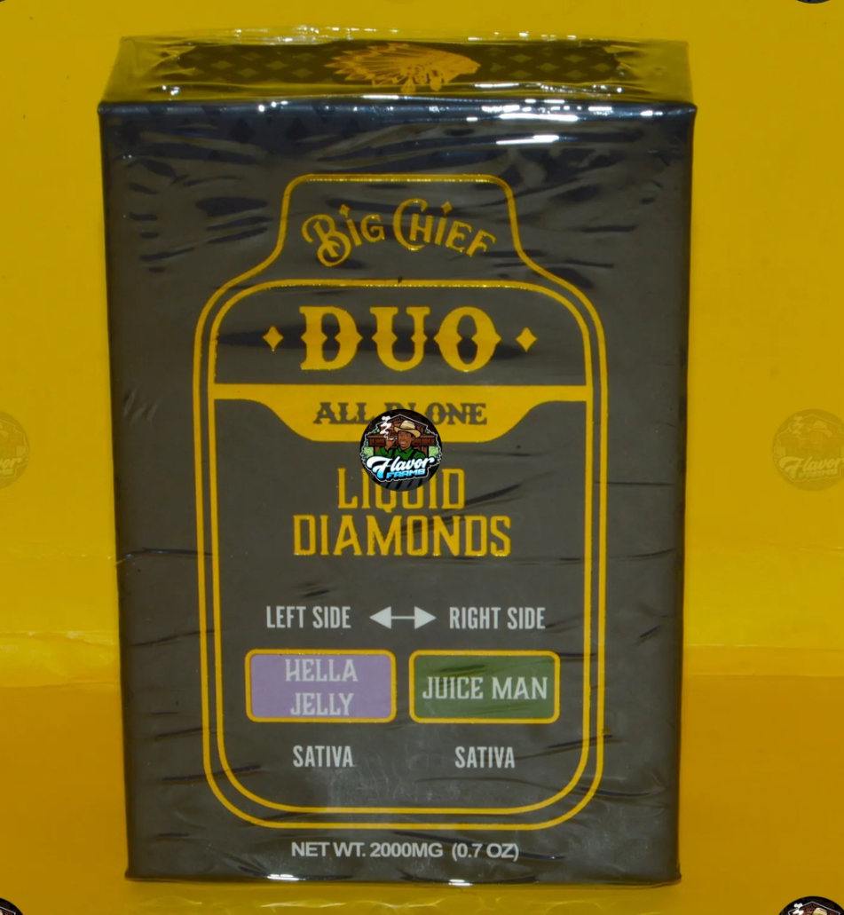 The BIG CHIEF DUO Liquid Diamonds Disposable Vape is a powerful, premium all-in-one device loaded with 2 grams (2000mg) of ultra-potent concentrate. Built for ease and endurance, it’s rechargeable and disposable, blending convenience with uncompromising quality. This dual-chamber device offers a “Duo” experience—potentially two different strains or flavor profiles in one sleek pen—giving users the freedom to switch things up with a single puff. Crafted with Liquid Diamonds—an ultra-refined form of cannabis concentrate known for its purity and potency—each hit delivers a fast-acting, terpene-rich cloud that hits clean and hard.