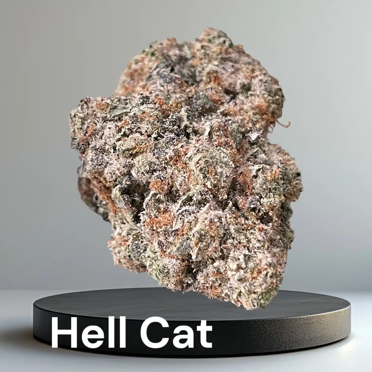Hell Cat, also known as “Hellcat,” is created by crossing the potent Raskal’s OG X SFV OG Kush strains. This bud has a sweet and fruity lemony citrus flavor with a lightly woody exhale. The aroma is of woody pine with a punch of sour, citrusy lemon and fresh fruits. Hell Cat buds have dense, pepper-shaped emerald-green nugs with lots of thin orange hairs and tiny white trichomes.