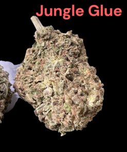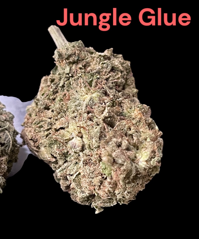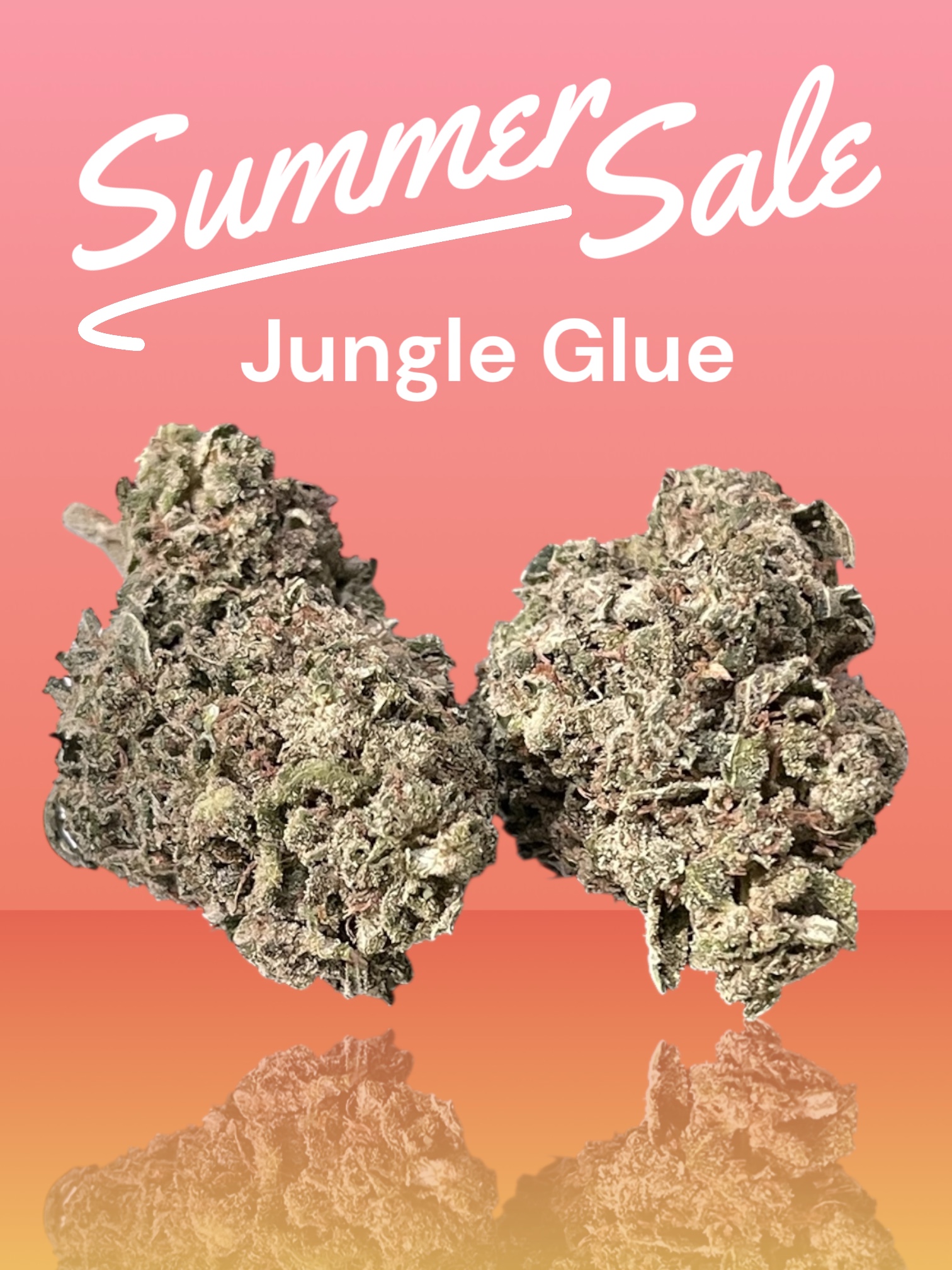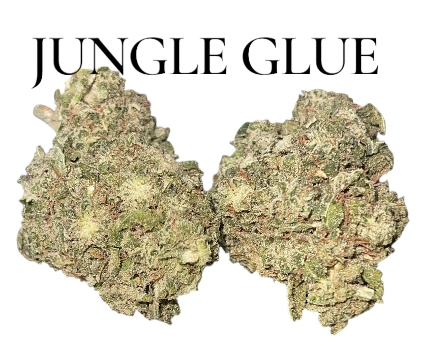 Jungle Glue is an evenly balanced hybrid strain (50% indica/50% sativa) created through crossing the potent Jungle Juice X Gorilla Glue #4 strains. This powerhouse combination creates an amazingly potent child strain with a delicious flavor and soothing, sleepy effects to go along with it. The taste of Jungle Glue is much like its parent strains, blending together sweet, citrusy tropical fruits with spicy grapes and a hint of flowery herbs. The aroma is light and fruity with a burst of tropical citrus accented by spicy grapes and peppery herbs. The Jungle Glue high will settle in quickly, rushing into your mind with a cerebral boost that fills you with an expansive sense of heady euphoria. As your happiness grows and expands with no ceiling, a relaxing body high will begin to take hold, eventually locking you down to the couch with a heavy sleepy sedation. Combined with its super high 25-30% average THC level, these effects make Jungle Glue a great option for treating chronic stress, chronic pain, nausea or appetite loss, insomnia, depression and muscle spasms or cramps. This bud has fluffy and small, heart-shaped forest green nugs with super thin orange hairs and tiny, sparkling amber-white crystal trichomes.