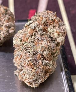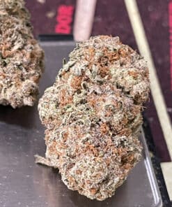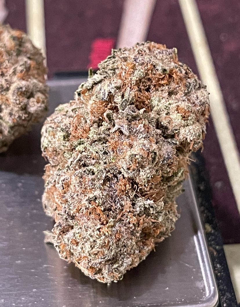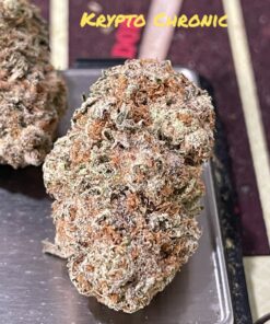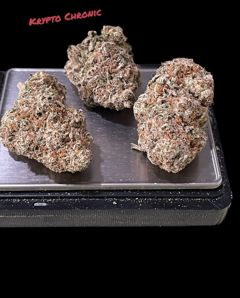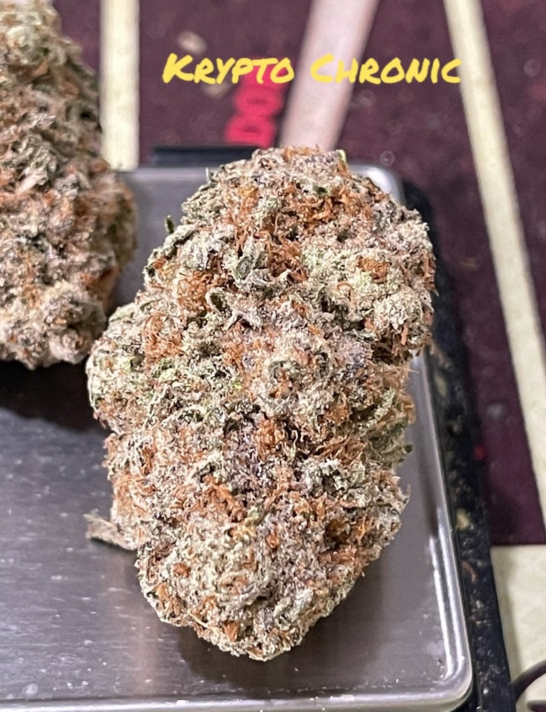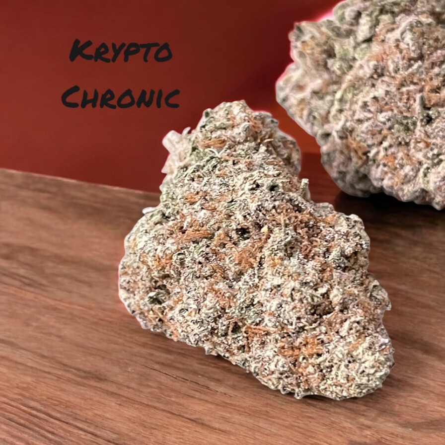 Krypto Chronic is a hybrid weed strain bred by Compound Genetics from a genetic cross of (Alien Cookies x Fruity Pebbles OG) x Jet Fuel Gelato and grown by Fig Farms. Clumpy buds of green and purple shine with opaque trichomes, and they reek of sweet peach, tar, and dirty gym socks.