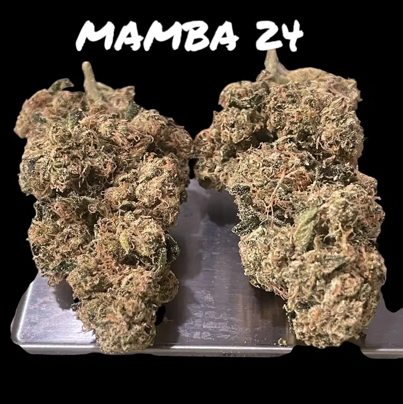Mamba never misses and always wears streaks of purple, while looking like a snow globe of trichomes — Our Mamba, a Lakers fan magnet, is a heavy indica with some great components of tart / minty and spicy / woody aromas. The almost equal parts of humulene and linalool enhance that spicy quality of the caryophyllene. This strain will leave a slight spice on your tongue like you just bit a small peppercorn. These two terps also provide floral and earthy undertones as well. Both alpha and beta pinene are present in this strain as a racemic mixture. They compliment each other well giving an underlying pine taste that makes this strain an amazing contrast of many qualities. Aside from the symphony of aromas, Mamba’s variety of terpenes provides numerous physical effects including stress relief, CB2 activation, pain relief, and slight focus improvement. Customers rave about the uniqueness of this strain.