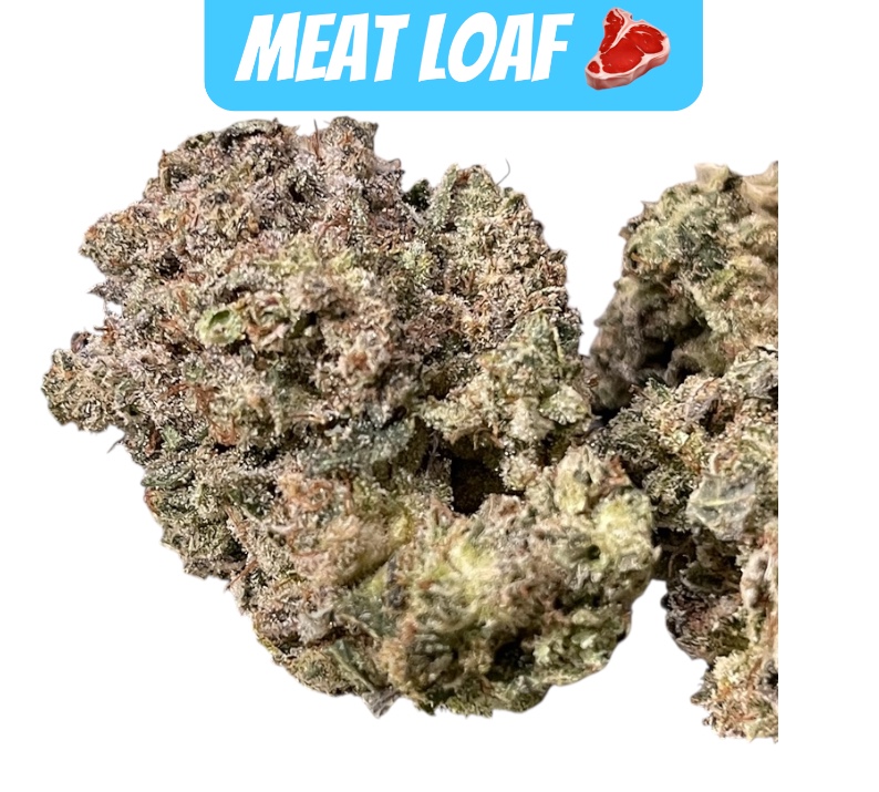 Meatloaf is a rare indica strain created through an unknown combination of indicas Known for its super meaty flavor, Meatloaf brings on a heavy hitting high that will have you feeling sleepy and out of it in no time flat. The high starts with a subtle lift that fills the mind with a calming sense of pure happiness. As your mind settles into this blissful state, a heady effect will come over you, leaving you totally unfocused and pretty stoned. A relaxing body high accompanies this hazy state, leaving you sleepy and slightly sedated before you pass completely out into a deep and peaceful sleep. With these effects and its high 35-38% average THC level, Meatloaf is often chosen to treat those suffering from conditions such as migraines or headaches, chronic pain, nausea or appetite loss and insomnia. This bud has a super unique meaty herbal flavor with a lightly sour diesel exhale. The aroma is of earthy herbs and sour diesel with a dank spicy overtone that’s almost like rotting meat. Meatloaf buds have oversized fat airy dark olive green nugs with rich amber undertones, matching hairs and a coating of clear crystal trichomes that are dripping with sweet syrupy resin