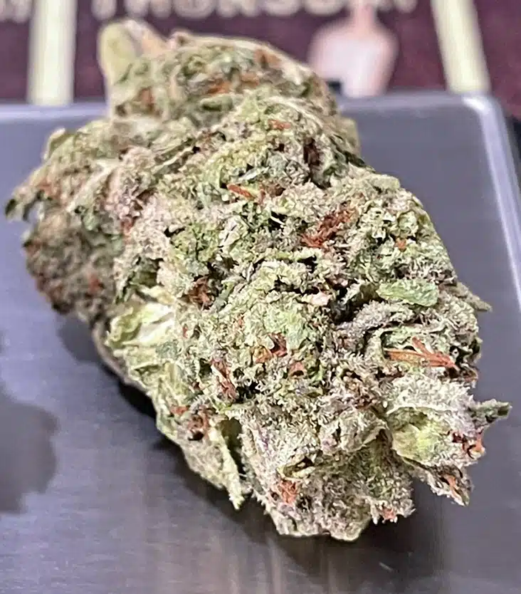 This strain has deep green buds covered in white crystals and offers a mix of earthy and spicy chocolate flavors. It also helps with stress, pain, and sleep issues due to its high THC levels.