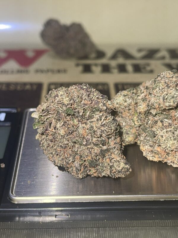Razzle also known simply as “The Raz” to most of the cannabis community, is an indica dominant hybrid (80% indica/20% sativa) strain created by the infamous Briargate Wellness Center in Colorado Springs as a potent cross between the insanely popular and delicious Blueberry X White Russian strains. This rare bud boasts a moderate THC level that ranges from 31-35% on average and a combination of both indica and sativa effects. Users describe the Razzle high as having an insanely relaxing body effect that doesn’t leave you sleepy upon the come down. You’ll feel substantially relieved from pain in both mind and body and borderline sedated. Upon the come down, you’ll fade into a deep body melt and couch-lock that leaves you in a dreamy state that ends in a deep and peaceful sleep. Due to these potent effects, Razzle Dazzle is said to be an ideal strain for treating patients suffering from conditions such as chronic pain, stress, mild cases of depression, and muscle spasms. These buds have a sweet raspberry aroma and a taste of sweet raspberry with a hint of pepper upon exhale. Razzle buds have small to medium-sized dense dark purple spade-shaped nugs with dark olive green undertones and sparse dark amber hair