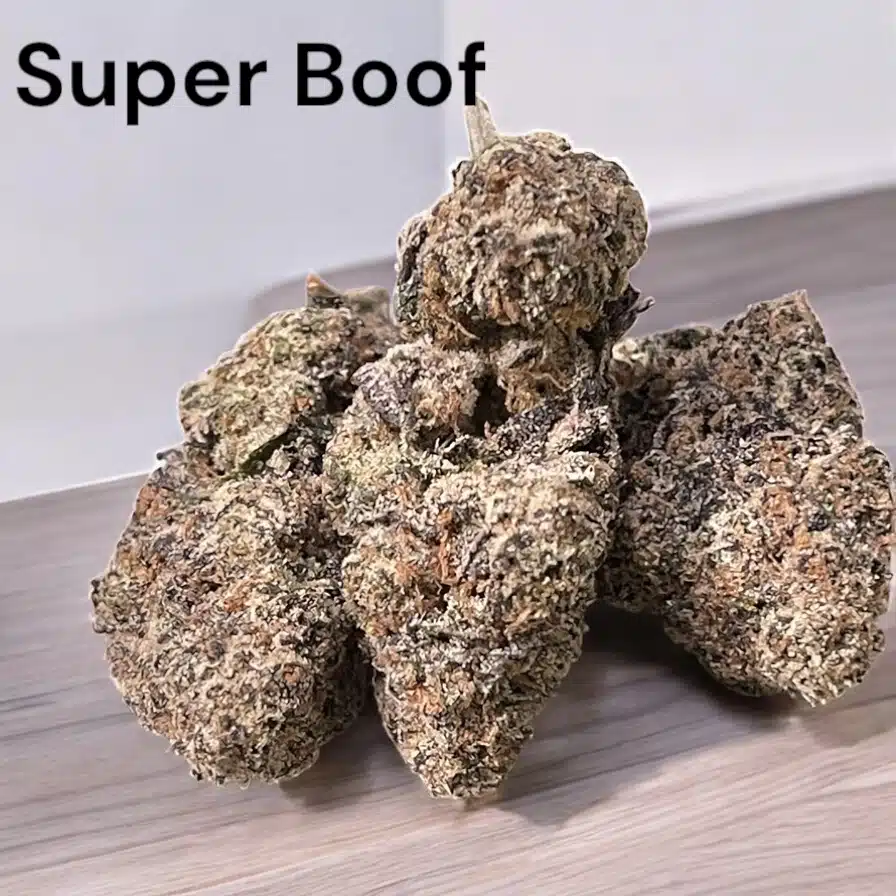 Super Boof is a zingy sativa strain made by crossing Black Cherry Punch and Tropicana Cookies. It has the same chunky, bright green buds as its parents